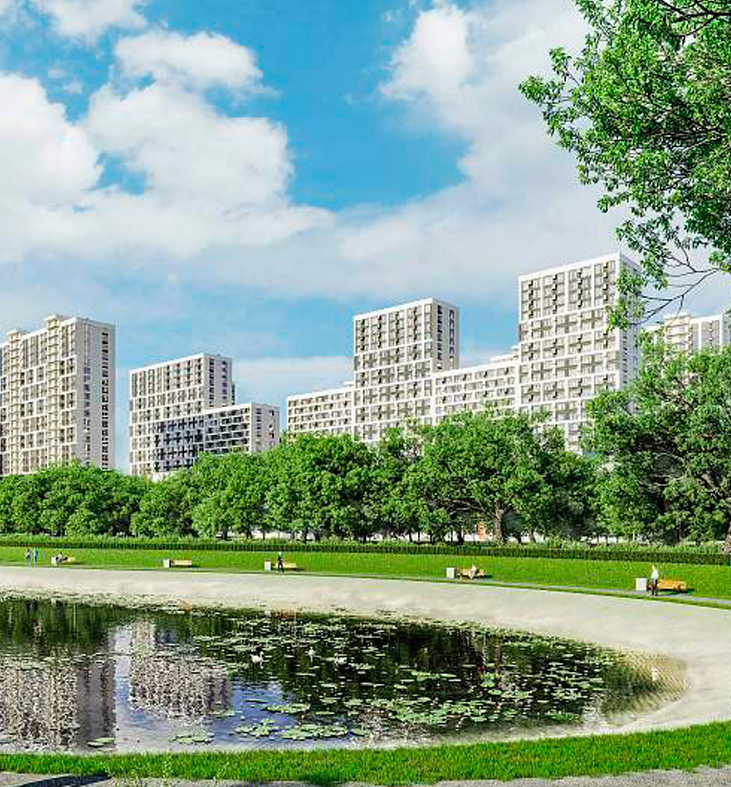 Жилой комплекс занимает обширную территорию в 71 гектар и включает 18 кварталов с 31 домом переменной этажности от 8 до 18 этажей. Внутреннее благоустройство включает дизайнерские холлы, консьерж-сервис, а также разнообразные зоны для отдыха, спорта и прогулок. Жители могут воспользоваться современными удобствами, такими как фитнес-центр, кафе и магазины, а также насладиться природой в собственном парке площадью 9 гектаров. Проект предлагает широкий выбор планировок квартир и развитую инфраструктуру, включая школы и детские сады.